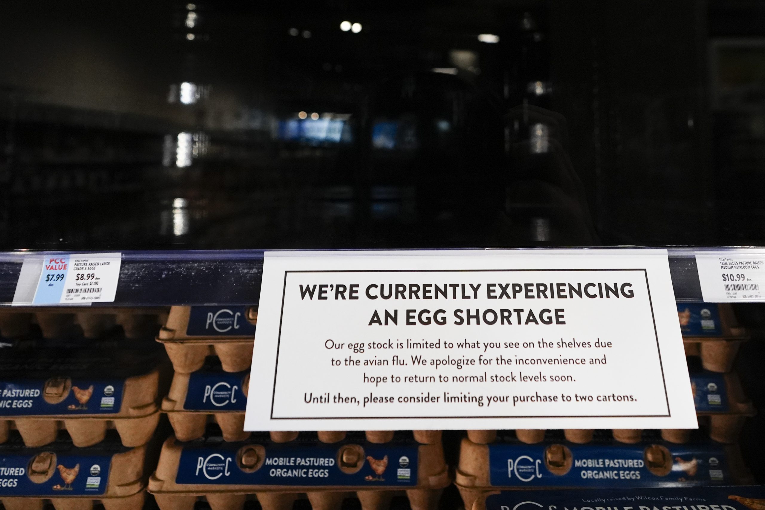 A sign asks customers to consider limiting their purchases of eggs at a PCC Community Markets grocery store due to shortages caused by avian flu, Monday, Jan. 27, 2025, in Seattle. (AP Photo/Lindsey Wasson)