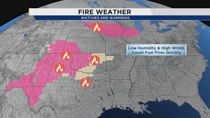 The same critical fire conditions are in place ahead of our severe weather event up north across Iowa, Illinois and eastern Nebraska.