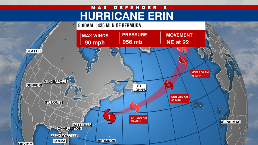 A turn toward the east-northeast with an increase in forward speed is expected today before Erin turns back to the northeast on Sunday, the NHC said.