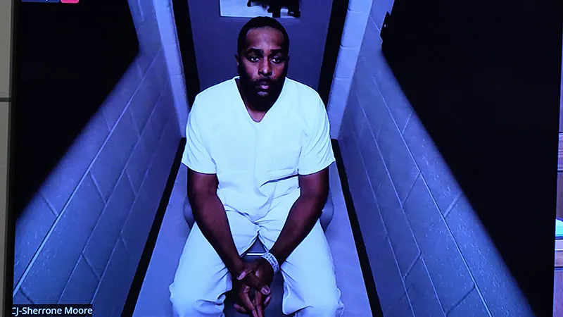 Moore appeared virtually on a television monitor at the arraignment on Friday. He was sitting in a compact, bare room wearing a white jumpsuit with his hands cuffed in front of him.