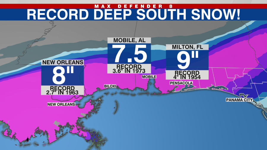 The heaviest snow fell in Louisiana, where the city of New Orleans piled up 10 inches of snow with isolated reports of over a foot. And Mobile, Alabama also shattered their record, picking up around 8 inches.