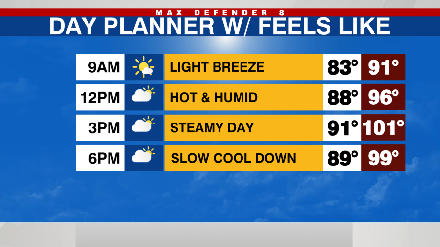 Feels like temps this afternoon will be back in the triple digits for many. Outside of a stray inland shower late this evening it will stay dry.