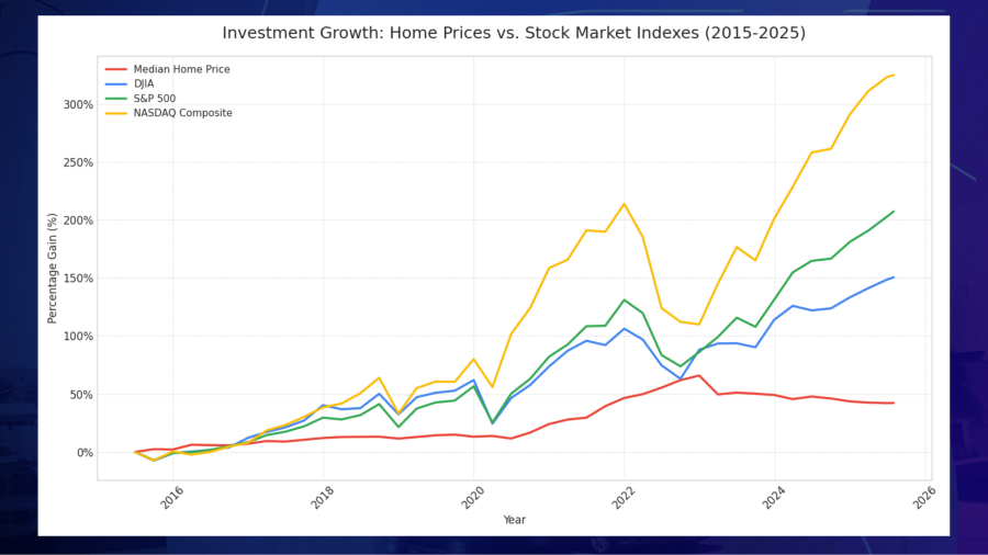 A graphic showing gains in the stock market compared to average single-family home prices 2015-2025. (Federal Reserve Bank of St. Louis)
