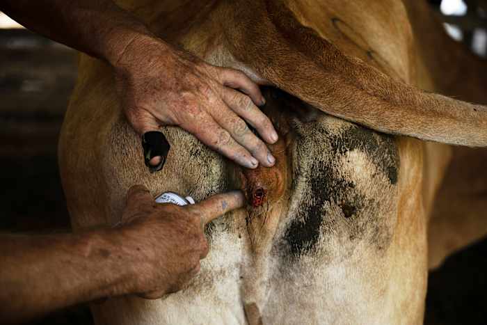 Armed with a pair of blue tweezers and an aerosol spray that helps draw the maggots out, Chávez moves from animal to animal. He puts maggots in plastic tubes as samples, which he provides to agricultural authorities.