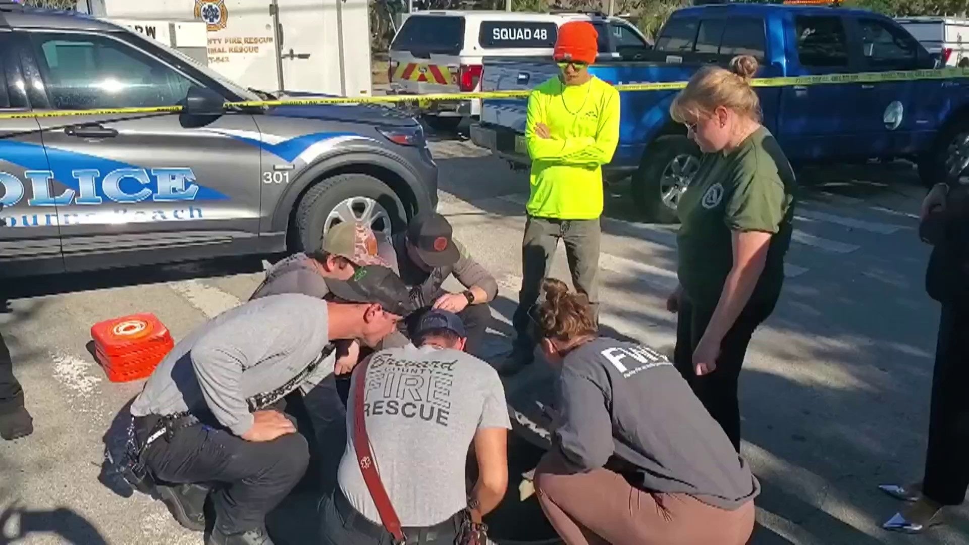 Video from the scene shows first responders surrounding a manhole along the roadway.