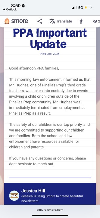 Then Friday, she got an email from her child’s school, PPA, saying a third-grade teacher, Mr. Huges, was arrested due to events involving a child or children outside of the Pinellas Prep community. The school said they took immediate action and terminated his employment.
