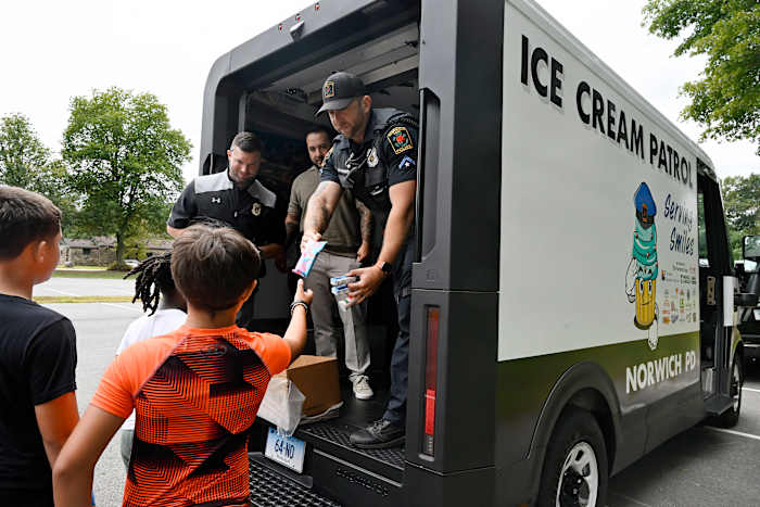 On a recent day, Norwich’s van stopped at a local school where children were participating in sports camps. It was a hit as officers handed out ice cream sandwiches, bubble gum-flavored pops and Italian ices.