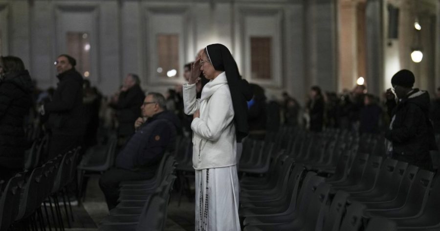A Catholic nun crosses herself during a prayer of the Rosary for Pope Francis in St. Peter’s Square at The Vatican, Sunday, March 9, 2025. (AP Photo/Francisco Seco)