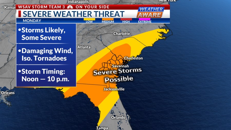 SAVANNAH, Ga. () — A strong but slow moving system that has been producing numerous rounds of severe storms across the country will impact the Coastal Empire and Lowcountry on Monday.
