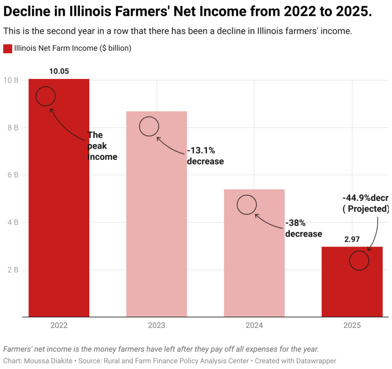 The implementation of tariffs comes at times when Illinois farmers are already facing a difficult time with commodity prices going down and operation costs rising. According to a report by the Rural and Farm Finance Policy Analysis Center in 2024, Illinois’s farmers net income was expected to decrease by 31 percent.