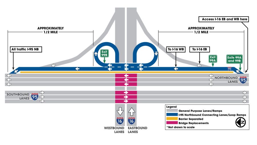 Drivers on I-95 north will have to make exiting decisions sooner. The new connecting lane system is separated from interstate by a barrier allowing more distance to safely enter and exit at the I-16/I-95 Interchange.