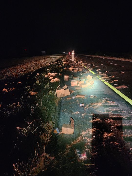 The refrigerated trailer had separated from the truck and scattered its contents across the median and into the northbound lanes. Fire personnel then worked to clear the debris and cheese boxes from the roadway, and the scene was handed off to the towing companies at 2:07 a.m.