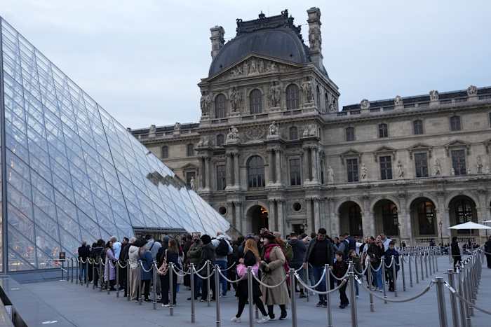 On Wednesday, October 22, 2025, eager visitors lined up to enter the Louvre in Paris, mere days after a bold daylight robbery saw historic jewels stolen. (AP Photo/Thibault Camus)