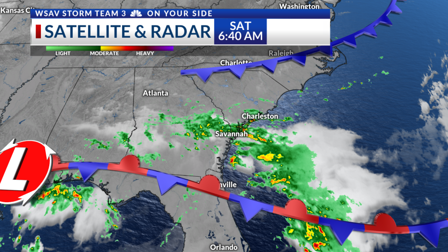 An area of low pressure moving along a stalled frontal boundary will help focus moisture and rain chances across the Coastal Empire and Lowcountry. Scattered rain gives way to numerous areas of rain and storms by midday.