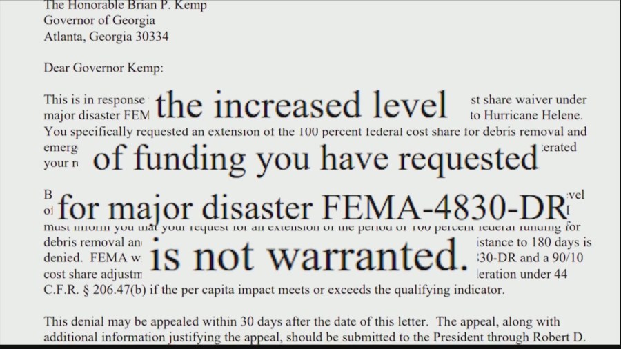 RICHMOND HILL, Ga. () — The Trump administration denied Georgia Governor Brian Kemp’s request to extend the deadline for Hurricane Helene victims to apply for assistance from the Federal Emergency Management Agency Friday.