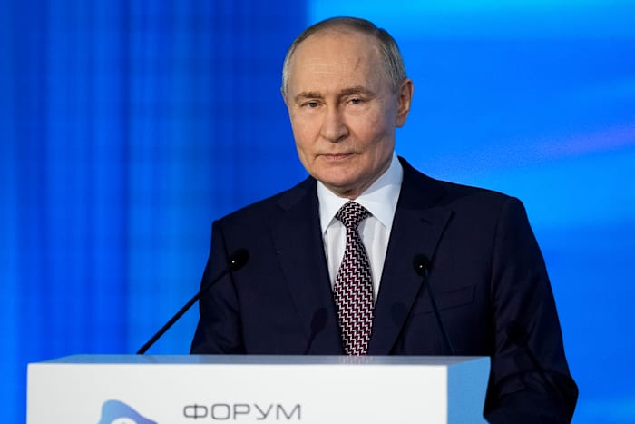 Russian President Vladimir Putin addresses a Technology Forum in Moscow, Russia, Friday, Feb. 21, 2025. (AP Photo/Pavel Bednyakov)