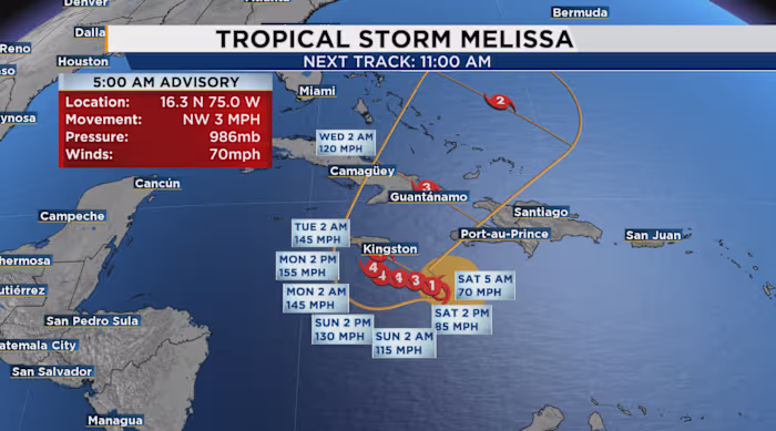 ORLANDO, Fla. – In the latest update from the National Hurricane Center at 5 a.m., Tropical Storm Melissa is showing improved organization this Saturday morning. The tropical storm is currently navigating the warm waters of the Caribbean Sea, an environment conducive to its strengthening.