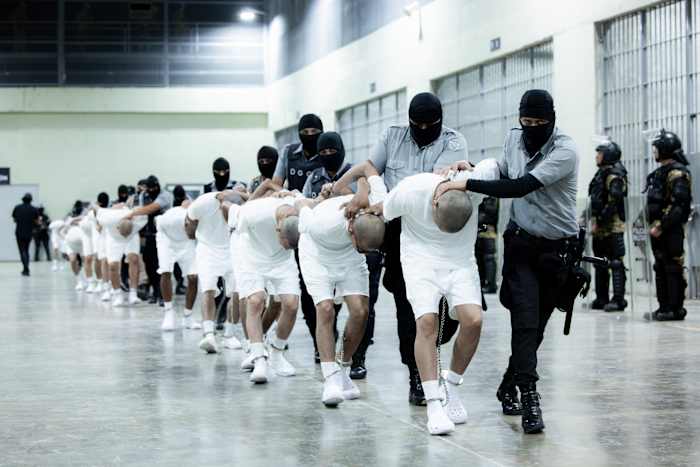 Video released by El Salvador’s government Sunday showed men exiting airplanes into an airport tarmac lined by officers in riot gear. The men, who had their hands and ankles shackled, struggled to walk as officers pushed their heads down to have them bend at the waist.