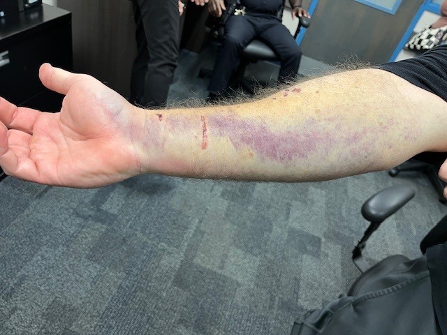 Officials provided photos showing some of the scrapes and bruises the officer sustained but said none of his injuries were serious. K-9 Bolo also suffered some scrapes on his paw and leg.