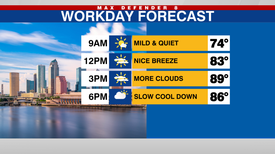 TAMPA, Fla. (WFLA) — Another warm and dry day is in store across the Tampa Bay area. Temps warm into the upper 80s and we’ll see filtered sunshine with more thin high clouds streaming through.