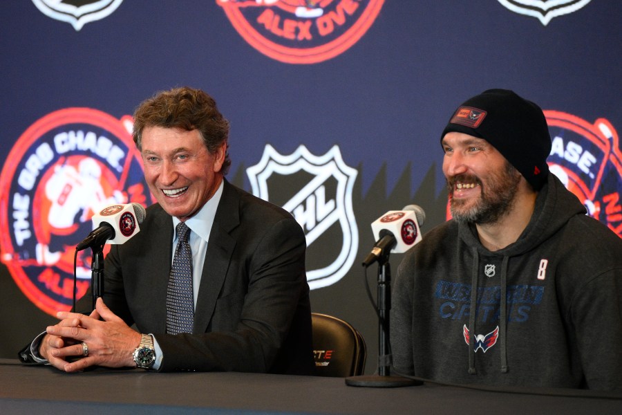 Wayne Gretzky, left, and Washington Capitals left wing Alex Ovechkin, right, at a press conference after an NHL hockey game between the Washington Capitals and the Chicago Blackhawks, Friday, April 4, 2025, in Washington. (AP Photo/Nick Wass)