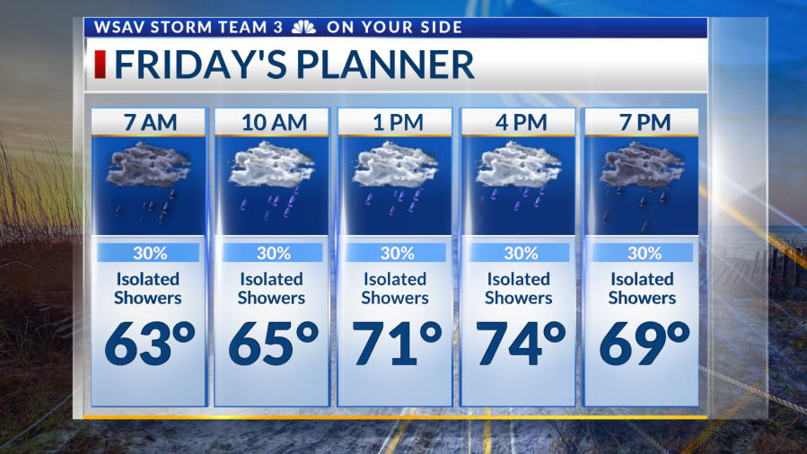 Friday will feature a mild start with temperatures in the 60s, giving way to a breezy and comfortable day with highs in the 70s. Winds will be around 10-15 mph with gusts of 25 mph or higher, especially east of I-95. There will be a 30% or so chance of passing showers but do not expect a washout or appreciable rainfall totals. Rain chances diminish by Saturday with only coastal showers early in the weekend.