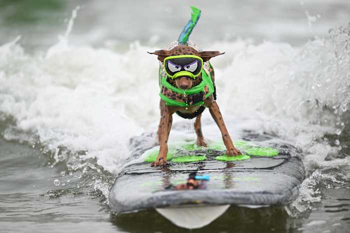 Charlie, aged 10, is due to enter the extra-large single surfer heat. He’ll also ride tandem with two other dogs, on what their owners call “The Dream Team.”