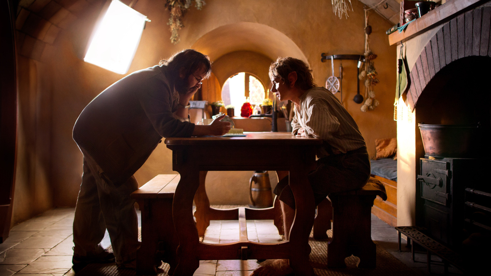A similar contraption was made the scene in which Gandalf visits Bag End to talk with Frodo about the One Ring. In the following conversation, they retreat to the kitchen, where Frodo boils water and pours the Wizard some tea. The two characters appear to be interacting across a rectangular table and looking each other in the eye as they talk, but they’re actually in different parts of the room. This is part of Peter Jackson’s use of forced perspective to help shrink Hobbit actors when acting next to their larger counterparts.