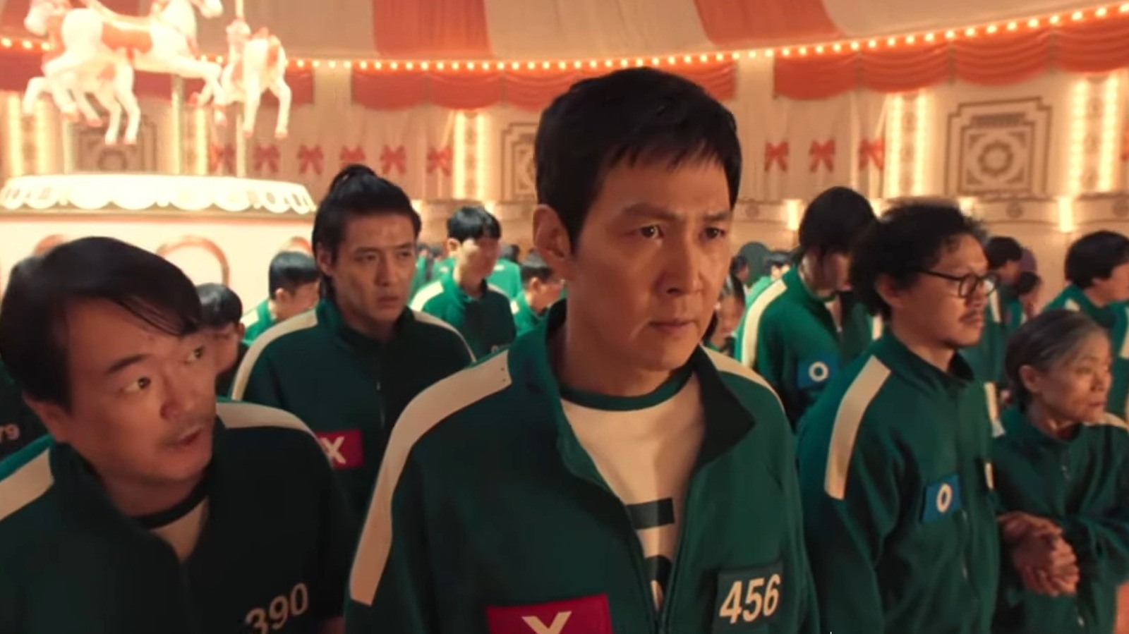 This is especially true during Mingle, the best new game of “Squid Game” Season 2. As the contestants stand on a massive, turning carousel, bracing themselves for the panic that will ensue when they’re forced to break into groups of a designated number, the earworm-inducing “Round and Round” is heard. Despite the upbeat melody and children’s voices singing, “Dunggeulge, dunggeulge,” the players are terrified … except, of course, Thanos (Choi Seung-hyun), whose dark story mirrors that of the actor who plays him.