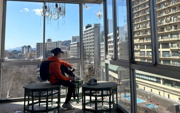 Person filming abandoned Japanese hotel overlooking other buildings.