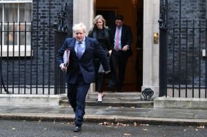 An image collage containing 1 images, Image 1 shows Boris Johnson and Cleo Watson leaving Downing Street