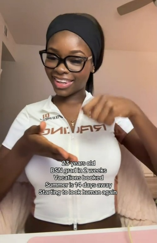 She wrote alongside the clip: “23 years old. BSN grad in 2 weeks. Summer is 14 days away. Starting to look human again.”