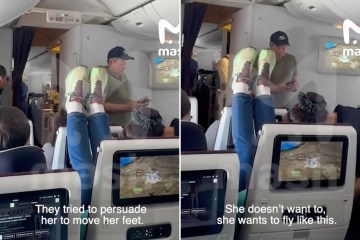 Shock moment plane passenger rests her FEET on headrest in act of revenge