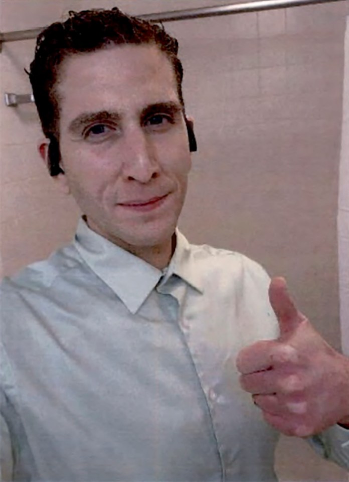In the selfie, Kohberger flashes a closed-mouth smile while standing in an empty tiled bathroom. He has wireless earbuds in his ears and is wearing a dress shirt that’s buttoned up to the collar.