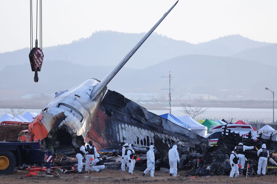 A police forensic team conducts an on-site investigation at the scene of the Jeju Air crash