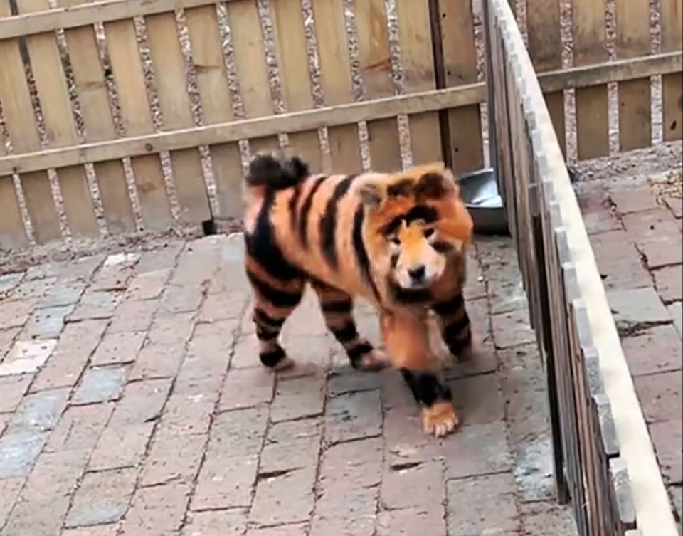 From this angle, it’s clear the cuddly creature is not a tiger cub but a coloured canine.
