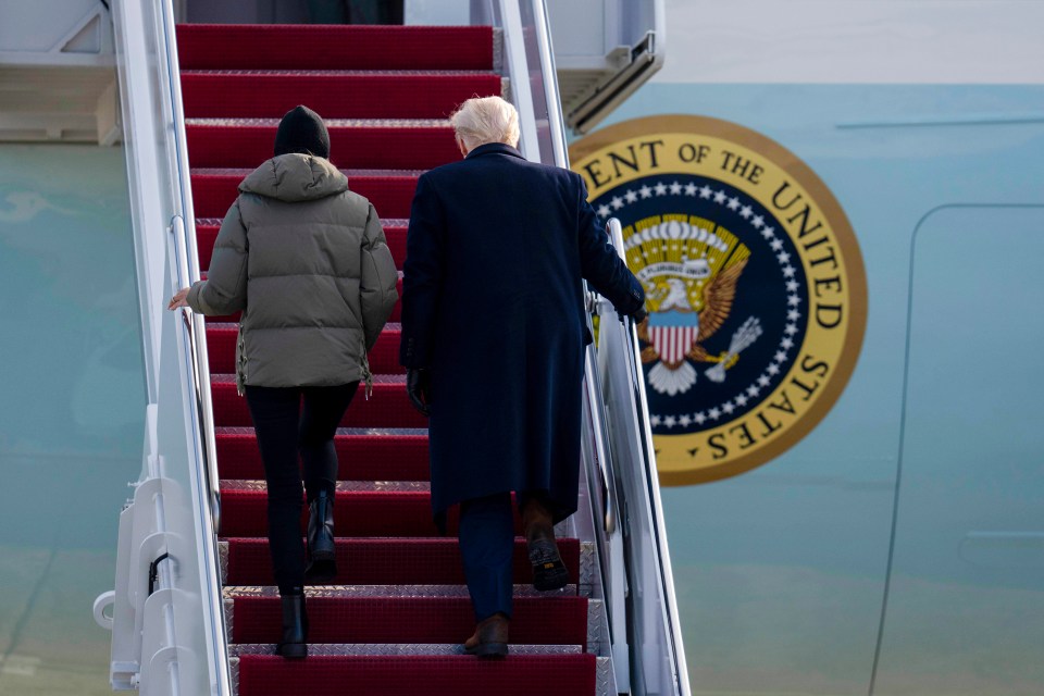After his speech, Trump went to Air Force One and walked up the steps with Melania, who had also visited the storm victims.