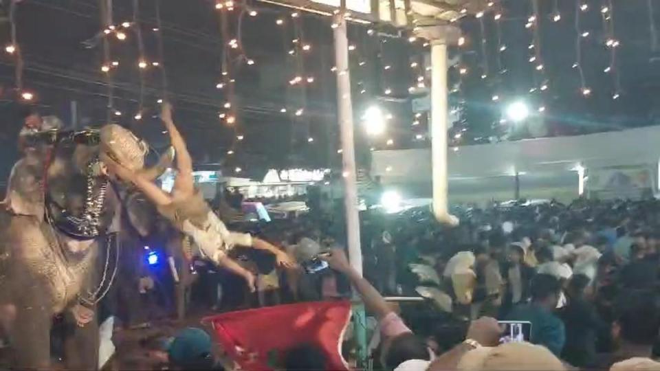 Footage shows an elephant, called Pakkathu Sreekuttan, storming forward and violently attacking a reveller, swinging him like a rag doll.