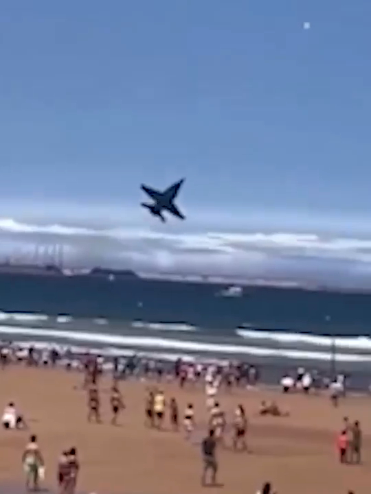 Shocking footage shows a Spanish Air Force EF-18 Hornet roaring over San Lorenzo Beach, its nose diving towards the sea before pulling up just metres from sunbathers.