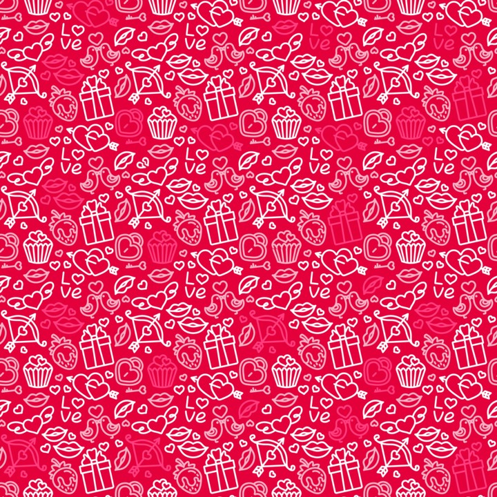 The image features numerous drawings of hearts, lips, chocolate covered strawberries, cupcakes and presents.