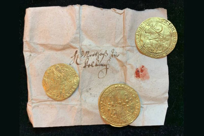 The hoard included a rare “golden angel” coin, gold ducats, various silver coins and hundreds of ancient pennies.