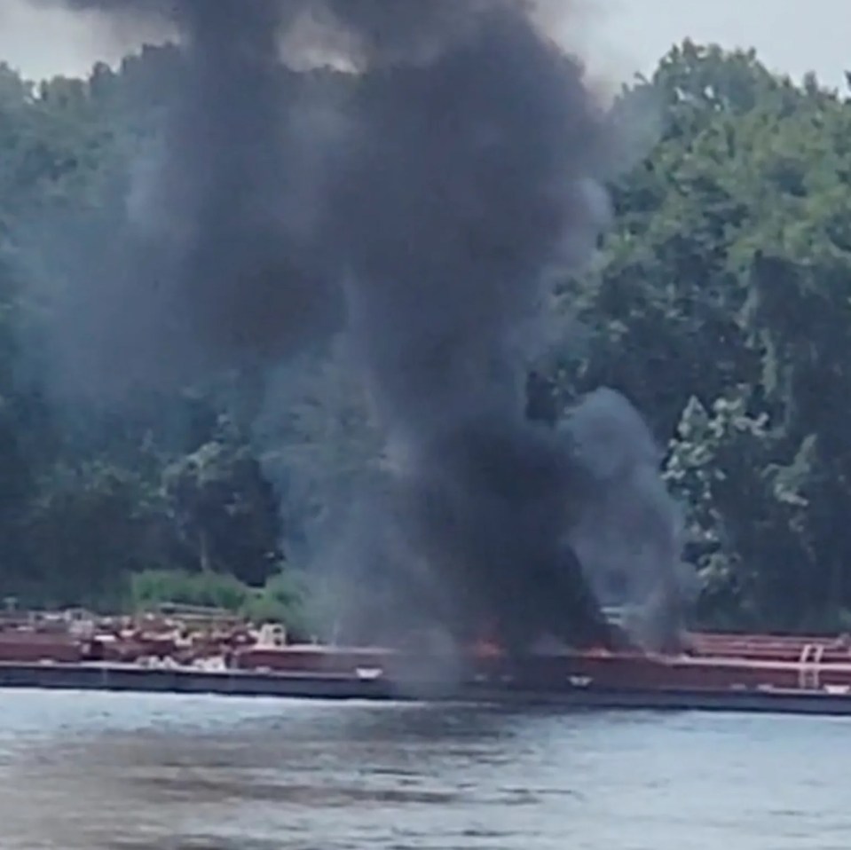 Smoke rising from a barge fire on a river.