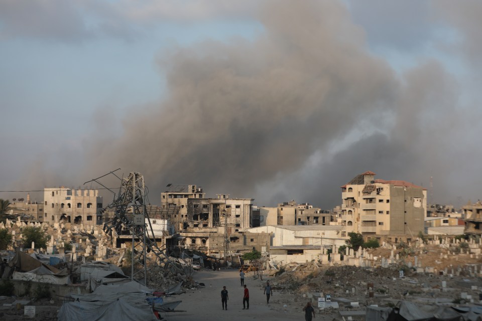 Smoke rises over damaged buildings and a cemetery in Gaza City after airstrikes.