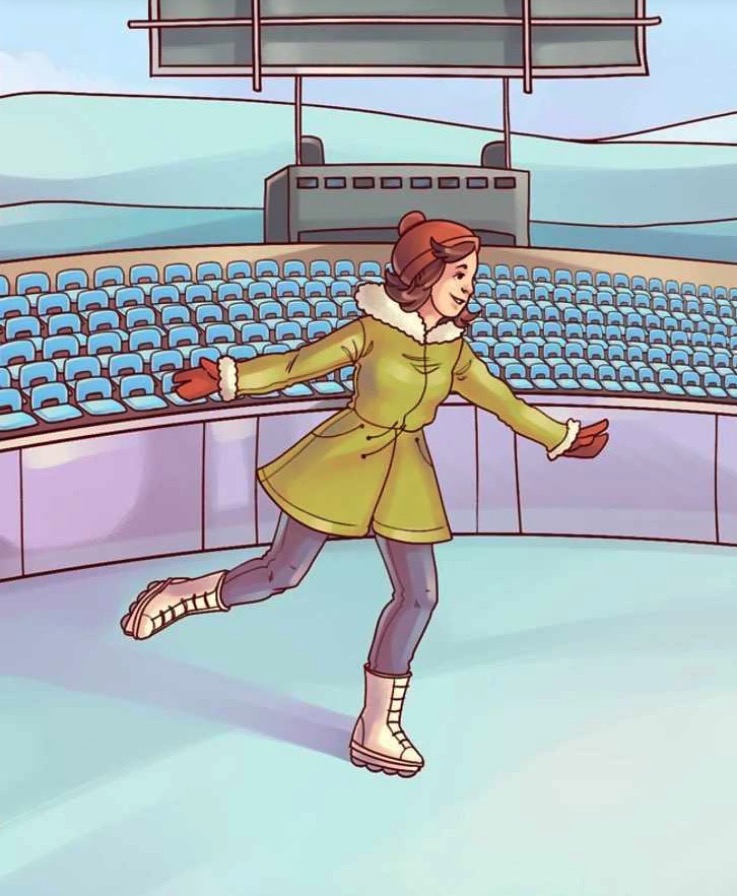 Illustration of a woman ice skating in an arena.
