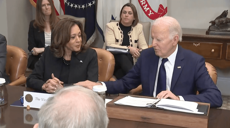 As he handed the mic to Vice President Kamala Harris, the US President said: “Fire away… no pun intended.”