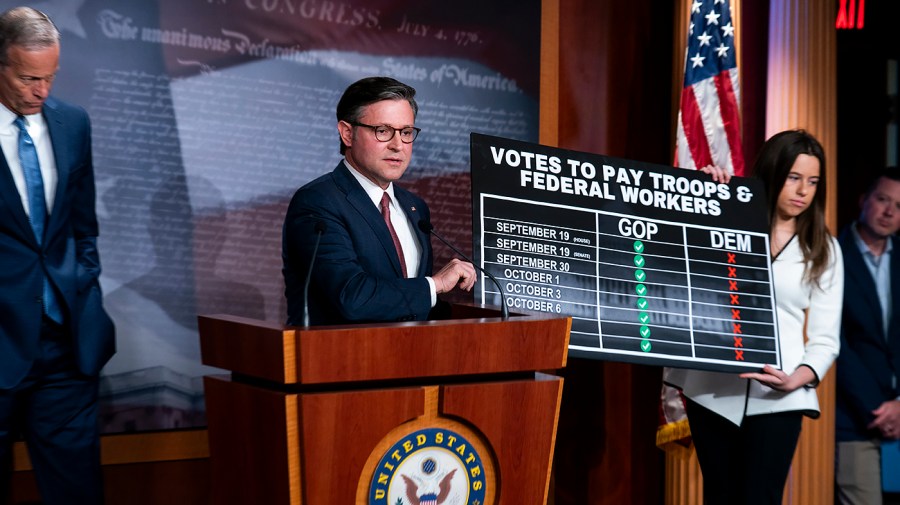 House Speaker Mike Johnson (R-La.) on Saturday cast blame on Democrats for a looming lapse in military pay as the shutdown impasse persists, pointing to seven failed votes in the Senate to pass his stopgap funding bill.