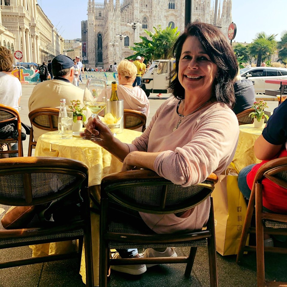 Woman sitting at an outdoor cafe with a glass of white wine, Duomo di Milano in the background.