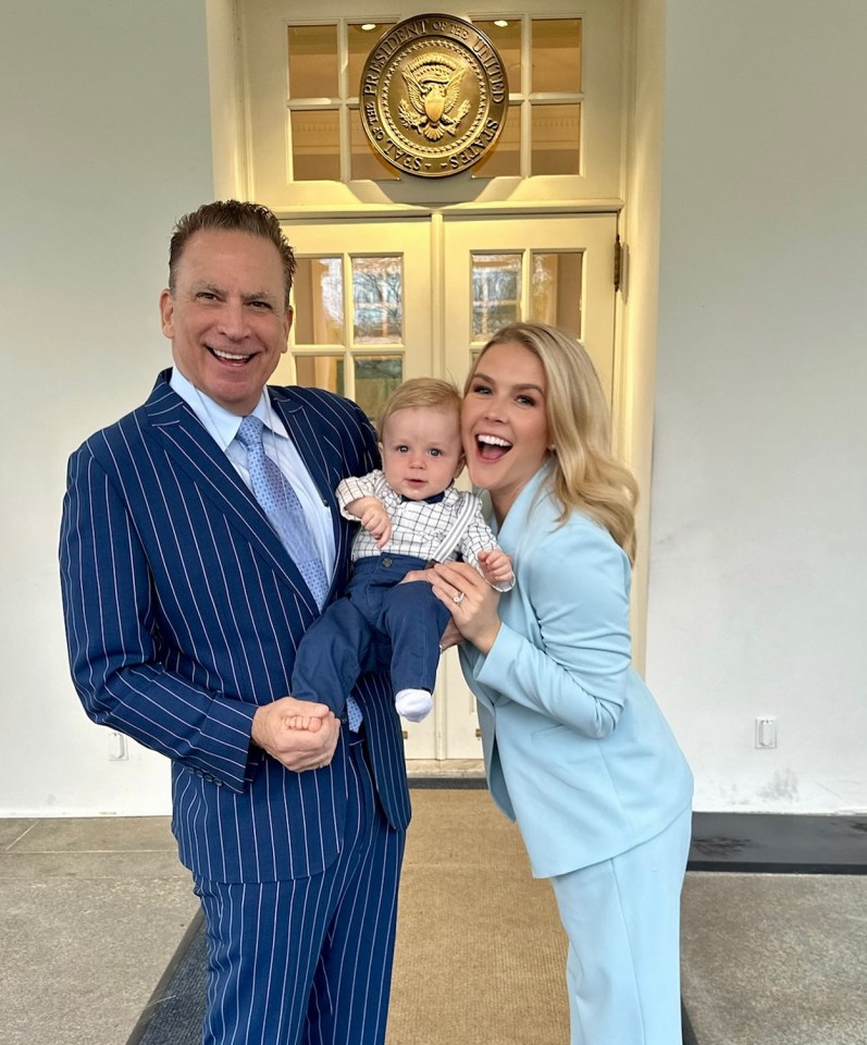 Leavitt’s husband, Nicholas Riccio, brought their eight-month-old baby boy to visit the working mom in her role as the White House press secretary on Tuesday.