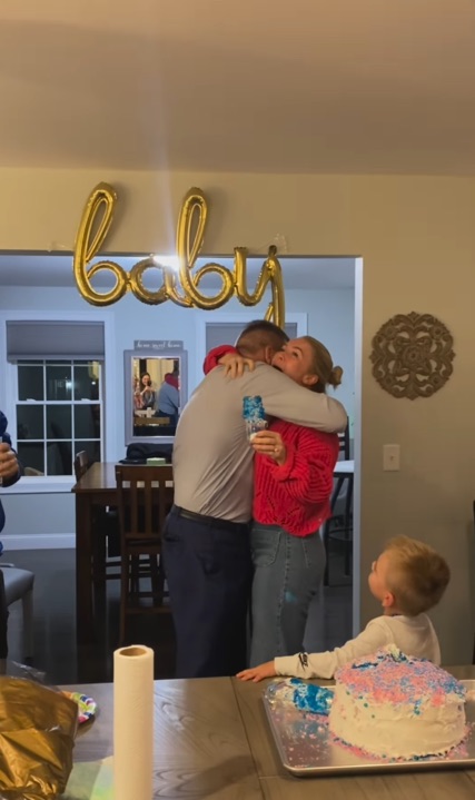 Couple embracing at a gender reveal party.