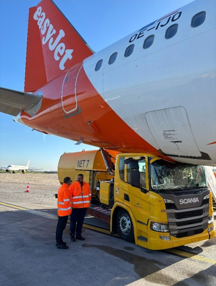 A yellow truck collided with an EasyJet plane on an airport tarmac.